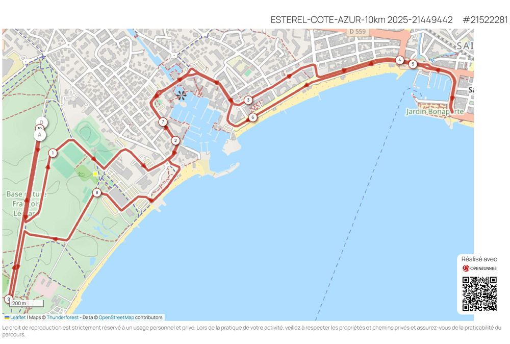 Au départ de la Base Nature François Léotard de Fréjus, le parcours du 10 km Estérel Côte d’Azur offre aux athlètes un terrain de jeu idéal pour l’expression de la performance. Entièrement plat, large et fluide, il permet une mise en action progressive et un maintien constant de la vitesse. L’itinéraire longe le littoral avant de rejoindre le cœur de Saint-Raphaël, offrant un cadre à la fois spectaculaire et propice à la concentration. Le tracé en aller-retour favorise une lecture parfaite de la course, une gestion optimale de l’effort et des repères chronométriques précis. Couru en soirée, dans des conditions climatiques maîtrisées, juste avant le coucher du soleil, le parcours bénéficie de températures idéales et d’une luminosité apaisante. Soutenus par une ambiance dynamique et un public dense sur les portions urbaines, les coureurs évoluent dans un environnement pensé pour la vitesse, la régularité et la performance de haut niveau.